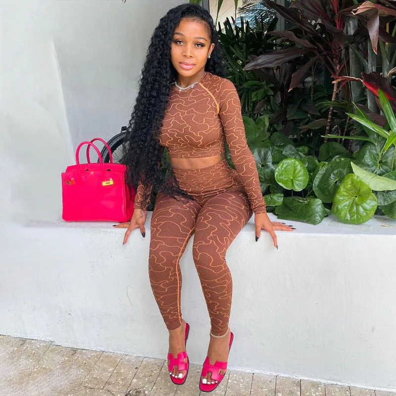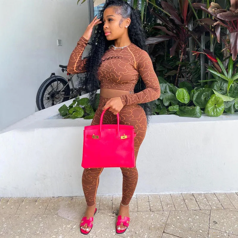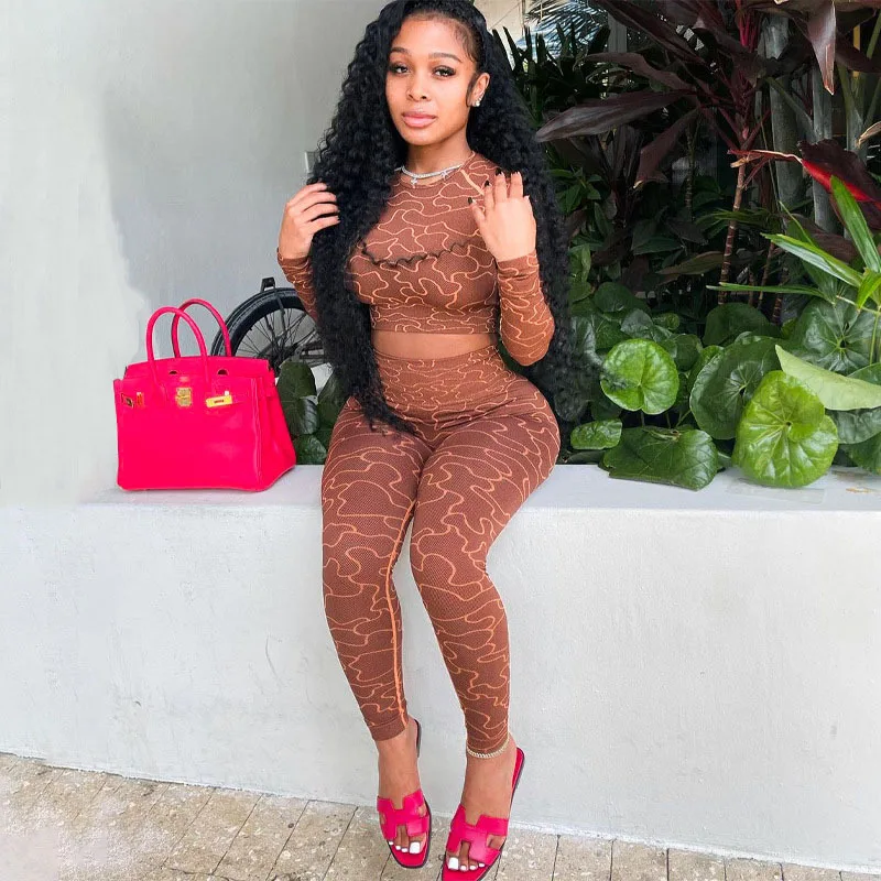 Wholesale Printed Fall Round Neck Long Sleeve Yoga Sports Crop Top Brown Two Piece Sets Women Clothing