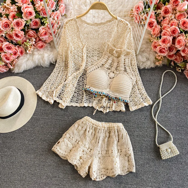 Fashion Bustier Top Hollow Out Sun Protection Cardigan Jacket High Waist Hooked Shorts Beach Resort Spa Swimming Costume Set